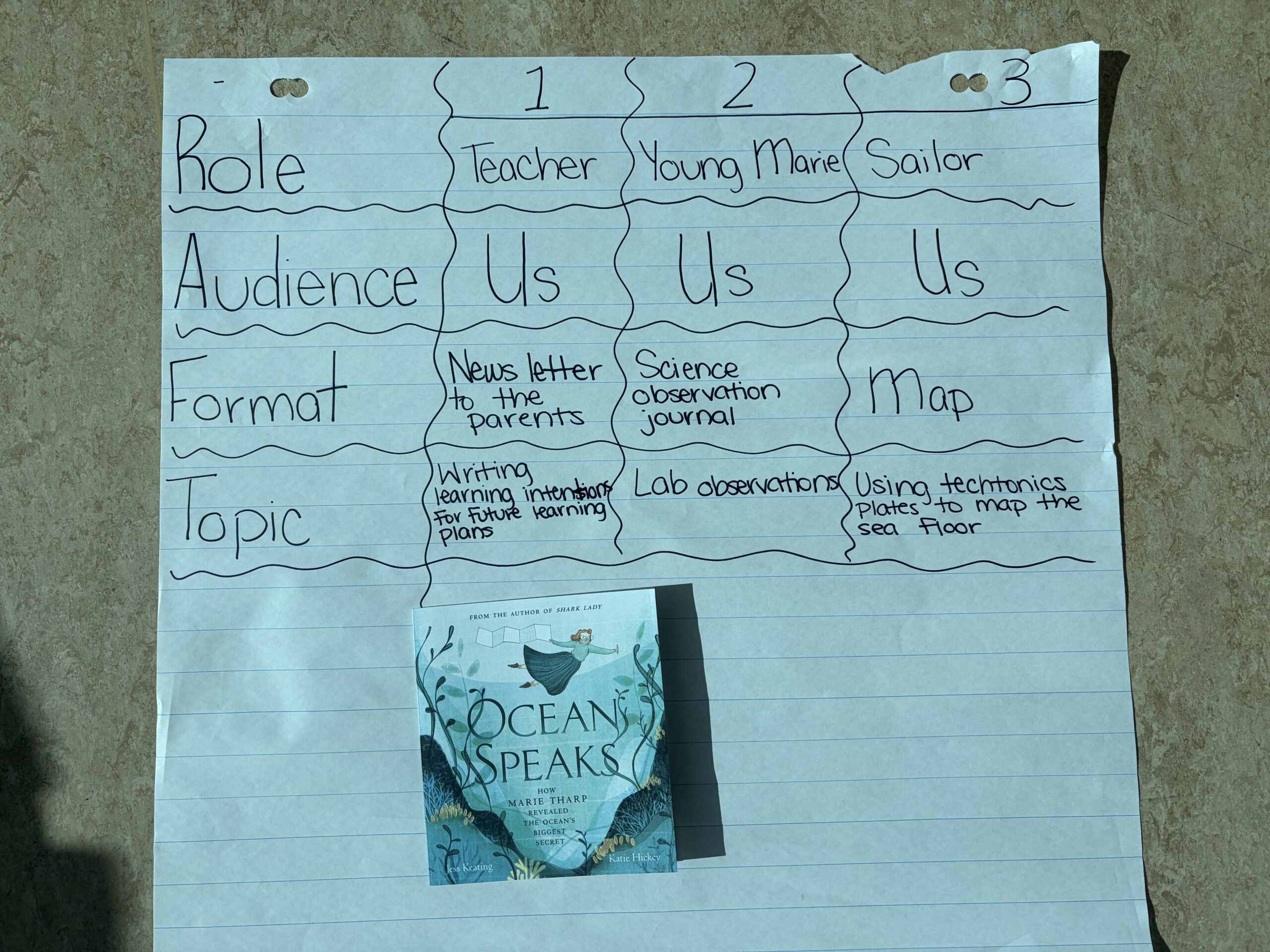 Or teachers could come prepared with the roles, audience, format, and content. This is what we did today in class, we made spinners, created our chart, switched our chart with a different group and then we spun our spinner to see what we were going to get for what we had to tell a story on.
